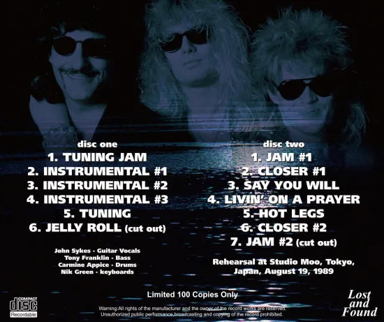 Rare BLUE MURDER rehearsal recordings make their debut! Recorded live by the sound engineer at the time during a rehearsal held at a Tokyo studio on August 19, 1989, the day before their first Japan tour performance that year. The sound quality is high-fidelity, akin to a soundboard recording, spanning approximately 90 minutes. Rather than a formal rehearsal, the content focuses mainly on a warm-up jam session. The extended improvisational exchanges, relaxed in the best sense, reaffirm the band's prowess in a way impossible to hear during regular live performances. Furthermore, it includes an intriguing short rendition of BON JOVI's “LIVIN' ON A PRAYER.” This previously unknown, invaluable recording makes its unexpected appearance right here!