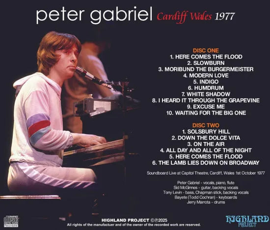 The October 1st, 1977 Cardiff, Wales concert from Peter Gabriel's first “solo” tour after leaving Genesis makes its debut as a complete recording from a superb quality soundboard source leaked by insiders! While the North American leg of the tour featured a band lineup including Robert Fripp, the European/UK leg saw Sid McGuinnis take over on guitar. The setlist was also changed. Beyond tracks from his first solo album, this soundboard live recording from his 1977 “solo” debut tour also features performances of Genesis' “Broadway Bustle” and a cover of The Kinks' “All Day and All of the Night”!