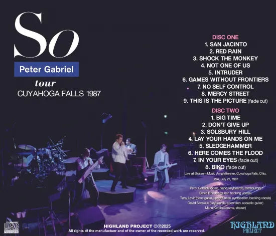Peter Gabriel's July 27, 1987 concert in Cuyahoga Falls, Ohio, from his “SO” World Tour, is now available for the first time in superb quality soundboard recording! Although there are some cuts, this stereo soundboard recording, believed to have been leaked by someone involved in the production, is of the highest quality and contains almost the entire concert. The set list includes hit singles such as “Sledgehammer,” “Don't Give Up,” and “In Your Eyes” from the album “SO,” which became a representative work of his solo career. featuring hit singles such as “Sledgehammer,” “Don't Give Up,” and “In Your Eyes.” This is a highly anticipated newly discovered recording that stands as one of Peter Gabriel's best live performances from the 1980s!